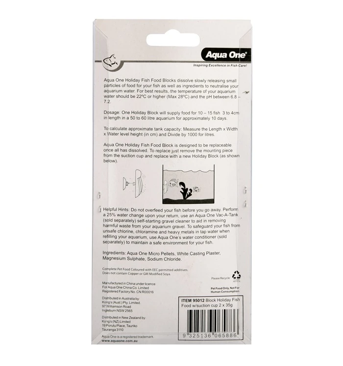 The Aqua One Holiday Fish Blocks dissolve slowly releasing small particles of food for your fish as well as ingredients to neutralise your aquarium water while you are away.