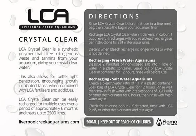 LCA Crystal Clear is a synthetic polymer that filters nitrogenous waste and tannins from your aquarium, giving you crystal clear water.