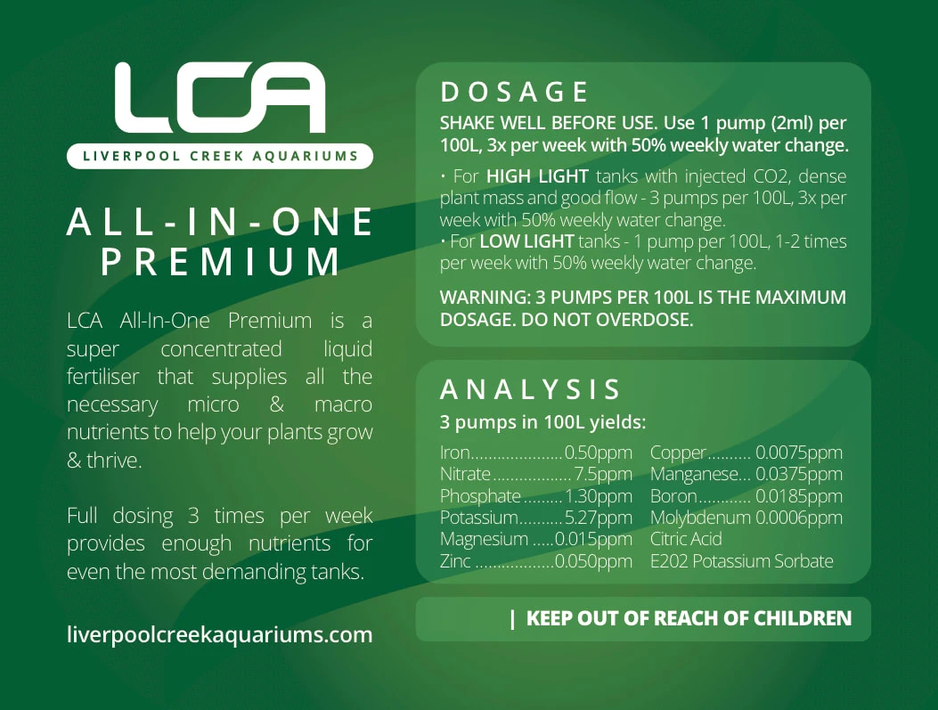 Liverpool Creek Aquarium’s All in-One Premium Liquid Fertiliser is a super concentrated solution that supplies all the necessary micro and macro nutrients to ensure that your plants grow and develop in a healthy way.
