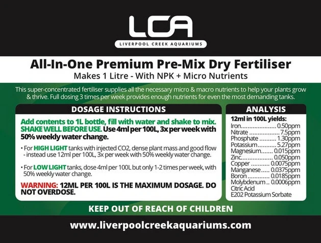 Liverpool Creek Aquarium’s Premium All-In-One Pre Mix Fertiliser is a super concentrated fertilser to supply all the necessary micro and macro nutrients to ensure that your plants grow and thrive.