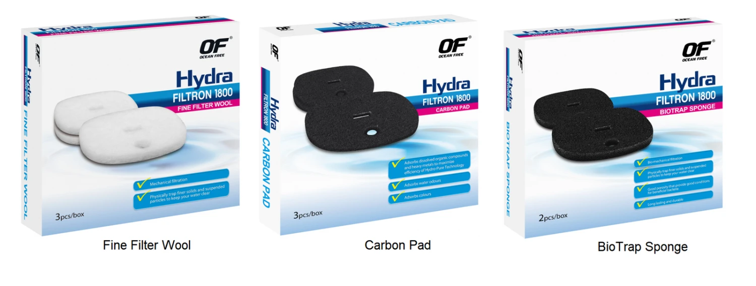 The replacement Fine Filter Wool, Carbon Pad, and Black BioTrap Sponge for the Ocean Free Hydra Filtron 1800 canister filter.