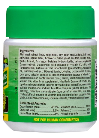 Fish meal, wheat flour, kelp meal, soy-bean meal, alfalfa, krill meal, spirulina, squid meal, brewer’s dried yeast, lecithin, shrimp meal, garlic, fish oil, fish eggs, betaine hydrochloride, calcium propionate (preservative), L-ascorbic acid (source of vitamin C), citric acid (preservative), natural mixed tocopherols (preservative), vegetable oil, rosemary extract, DL-methionin, L-lysine, L-tryptophan, taurine, guar gum, calcuim sulfate, a-tocopheral acetate (source of vitamin E), astaxanthin color, cantaxanthin color, niacin, panthinic acid (source of vitamin B5), vitamin A supplement, riboflavin (source of vitamin B2), pyridoxine hydrochloride (source of vitamin B6), zinc sulfate, manganese sulfate, menadione sodium bisulfite complex (source of vitamin K3 activity), thiamine mononitrate (source of vitamin B1), folic acid, cholecalciferol (source of vitamin D3), calcium iodate, copper sulfate, biotin, L-selenomethionine, sodium selenite, vitamin B12 supplement.