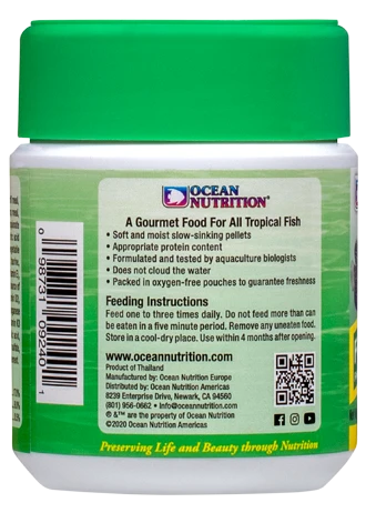 Ocean Nutrition Formula Two Pellets are a soft and moist slow-sinking food formulated using fresh seafood, spirulina (blue-green algae), kelp, and garlic.