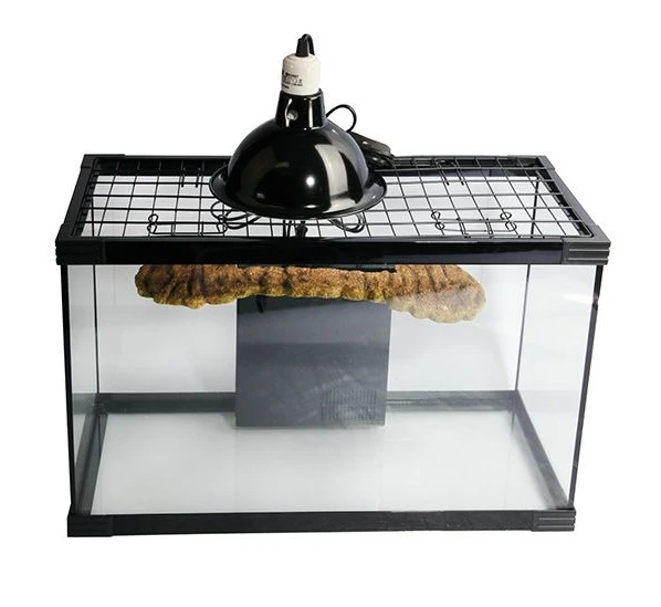 The turtle nursery kit includes a wire mesh lid, a fully submersible internal filter, a glass heater, UVB bulb, heat lamp reflector and a floating landing dock for your baby turtle to bask on.